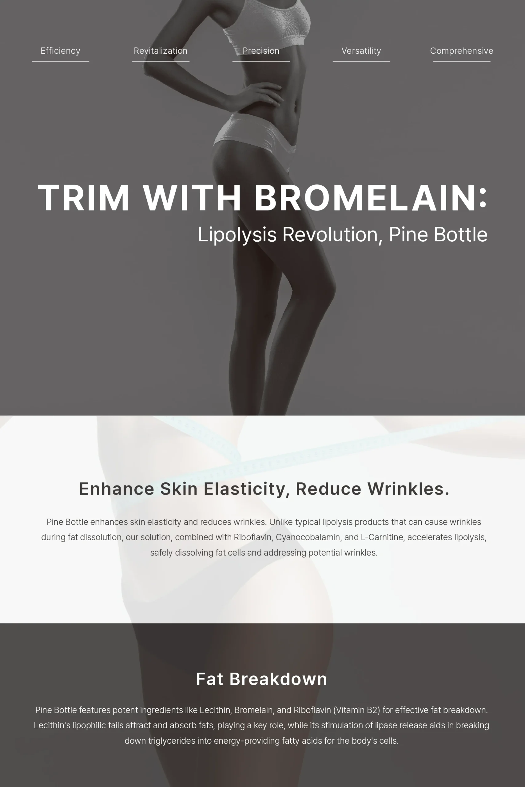 The main advantage of pine bottle injection lies in its multi-functional approach that goes beyond simple fat reduction. The product contains carefully selected ingredients—including plant extracts, amino acids, and compounds that stimulate microcirculation—to support the natural elimination of released fatty acids from the body. This synergistic combination helps optimize the function of the lipolytic process, leading to consistent and predictable contouring effects. Key benefits of Pine Bottle include: